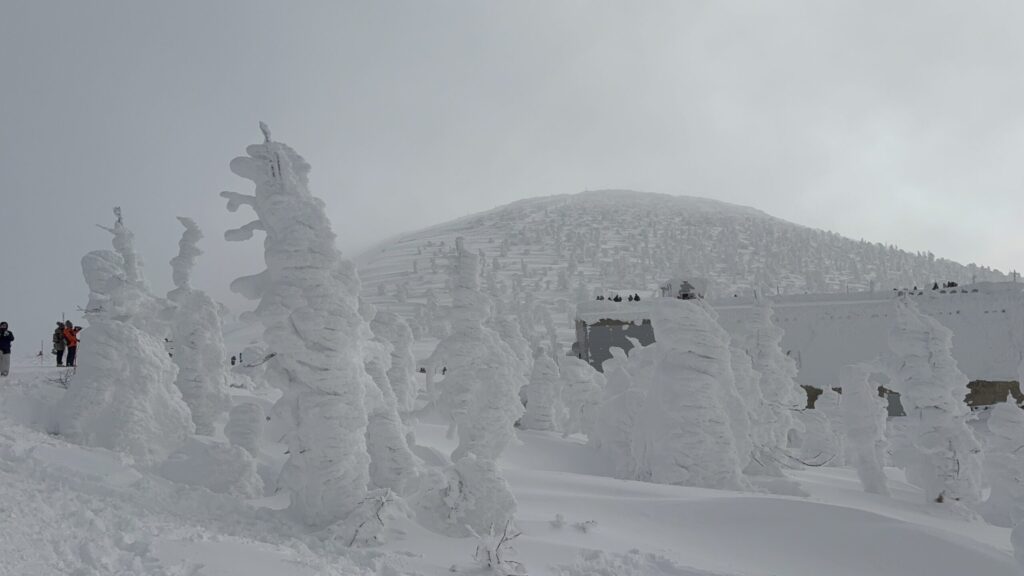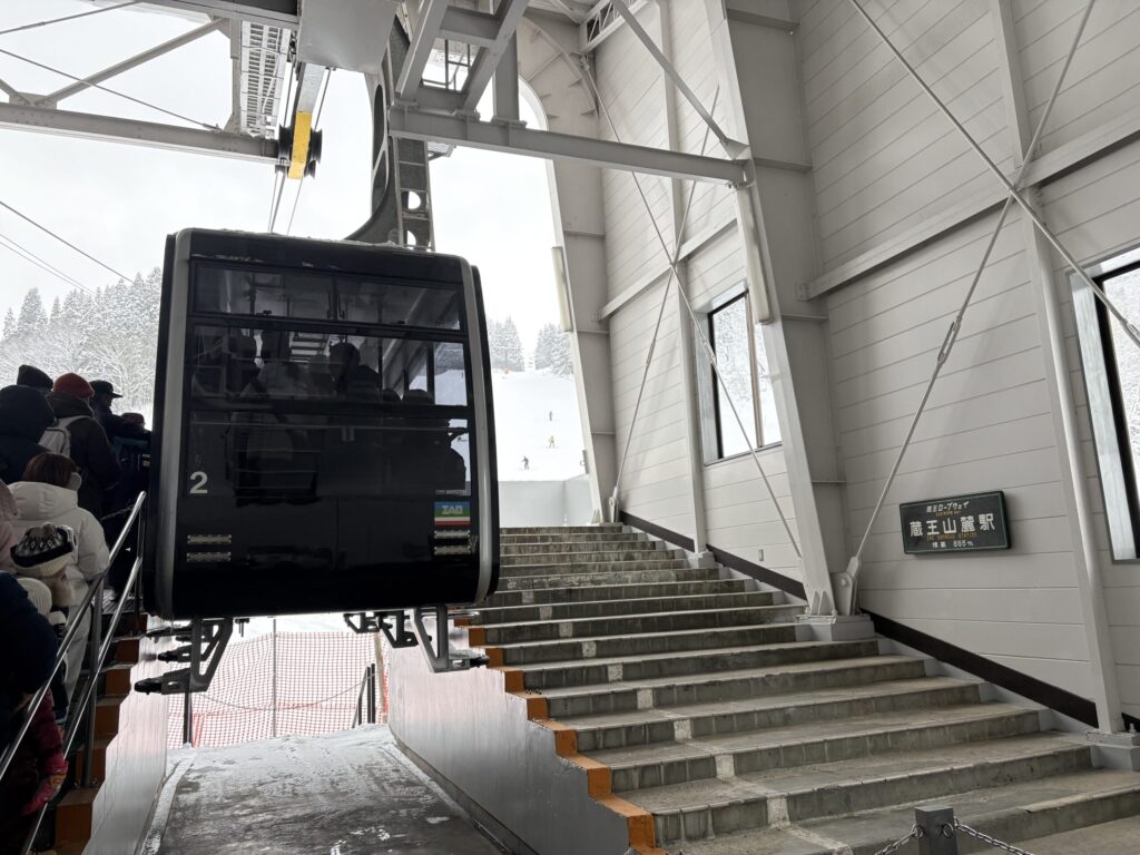 - 結構ギューギュー詰めです。最初は見えていた景色もすぐにガスで見えなくなりました。蔵王山麓駅(標高855m)ー樹氷高原駅(標高1331m)まで7分座るところは数人あとは皆さん立ったままです。樹氷高原駅からはスキーヤー ボーダーたちも乗ってきます。ただ、ロープウエイの種類が違って本数も多いので待つことはありません。全員座れます。樹氷高原駅(標高1331m)ー地蔵山頂(標高1661m)まで12分 周りは何も見えません。